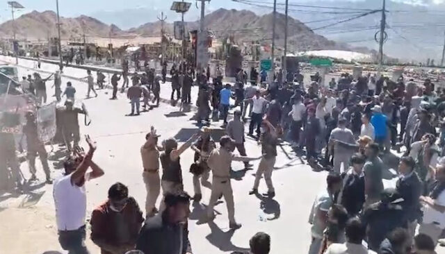 مقبوضہ کشمیر کے علاقے لداخ کو ریاستی حیثیت دینےکے مطالبے پر ہونے والا احتجاج پرتشدد رنگ اختیار کرگیا۔